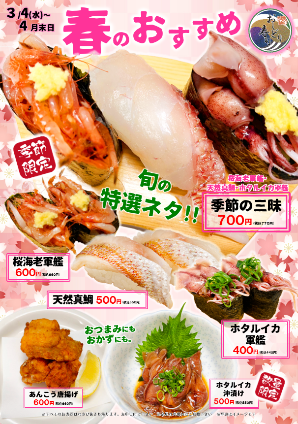 日に日にあたたかくなる季節、嬉しい限りです♪ ジャンボおしどり寿司、3~4月のおすすめが3/4(水)よりスタートしています!